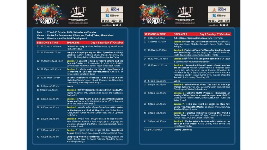 The speakers include environmental educator and community builder Kartikeya Sarabhai, renowned screenwriter Niren Bhatt, poet and diplomat Abhay K. lyricist Dr. Sagar, edupreneur and author Dr. Manjula Pooja Shroff, mythological author Kavita Kane, chairman of Gujarat Sahitya Academy Bhagyesh Jha, poet and novelist Mukul Kumar, Hindi blogger, writer and bureaucrat Krishna Kumar Yadav, Dr. Upendranath Raina, Dr. Heera Lal IAS, Ajay Chaudhry IPS, Manoj Aggarwal, IAS ( Retd.), Naishadh Purani and others.